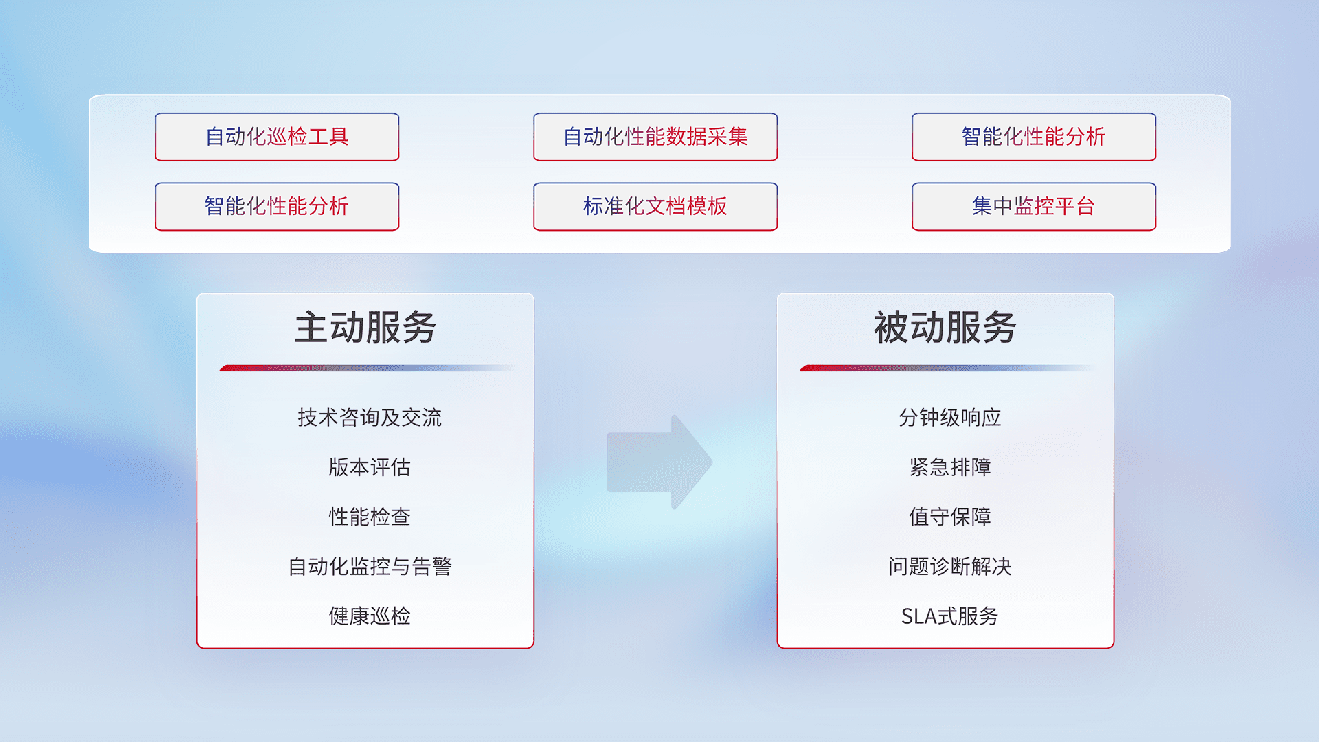 智能化工具和标准化文档,,保障服务质量,,,提供主动服务(包含技术咨询、、版本评估、、、性能检查、、自动化监控与告警、、、健康巡检)和被动服务包含(分钟级响应、、、、紧急排障、、、、值守保障、、、、问题诊断解决、、、、SLA服务)。。