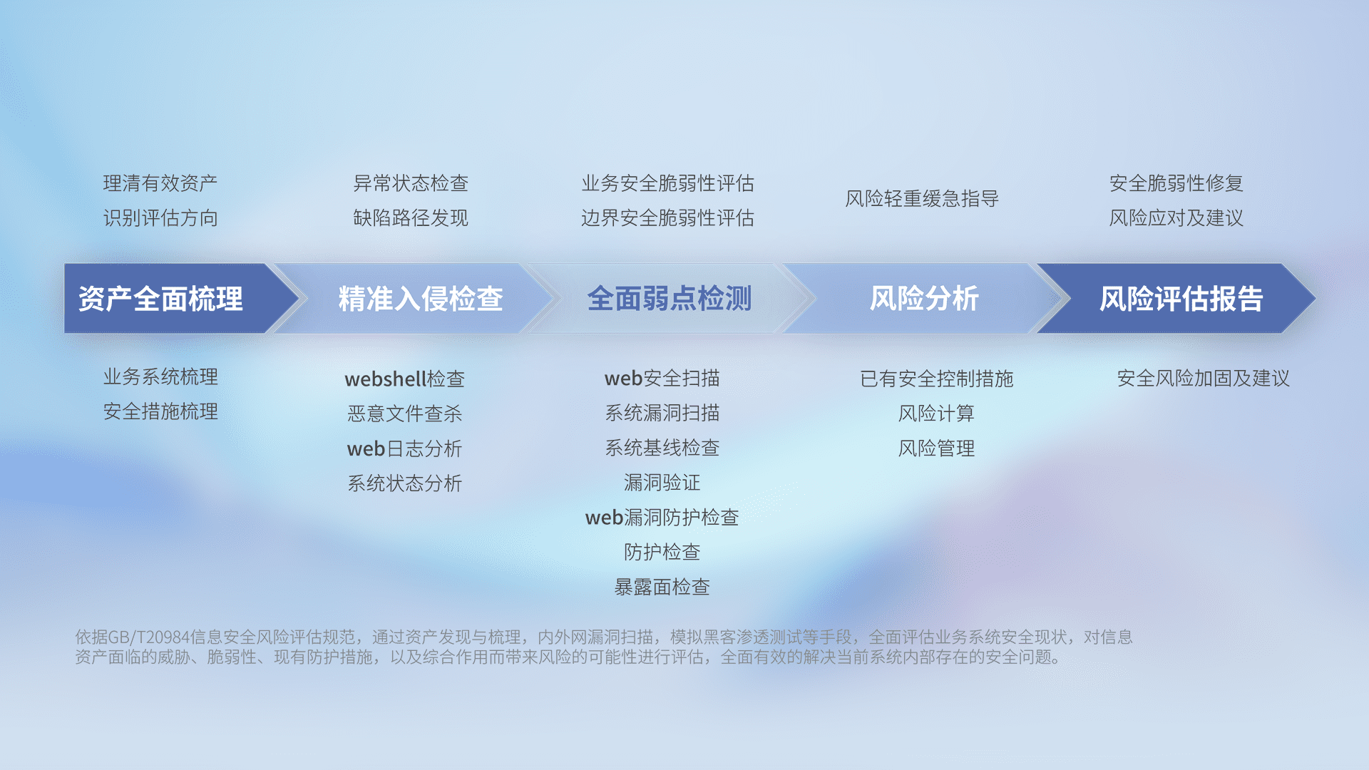 针对客户行业特性,,,,以专业的安全服务+多厂商联合解决方案提供专属的一站式安全管理服务,,帮助客户全面感知网络空间威胁,,,,基于识别、、、、检测、、、、分析、、防护、、监测、、响应的服务理论模型,,,从方案咨询、、集成交付、、评估验证、、、、优化加固、、、运维运营,,致力于为客户提供完整的闭环管理式安全服务。。。。以实战经验为客户打造高抵御风险的安全体系,,帮助客户发现威胁、、、对抗威胁、、、、处置威胁,,,,不断积累安全对抗能力,,持续保障数字化安全。。。